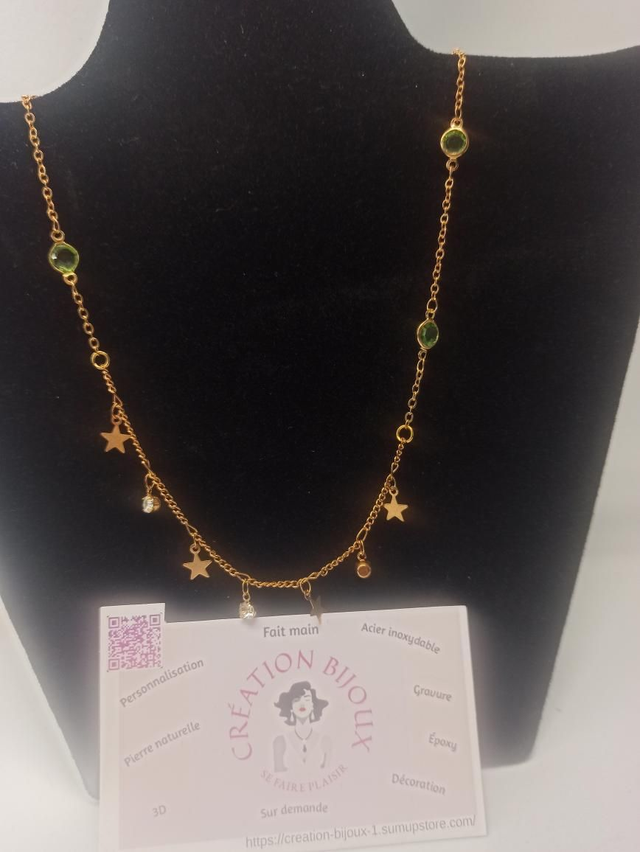 Acier inoxydable,2 mailles étoile/strass et perle en verre verte